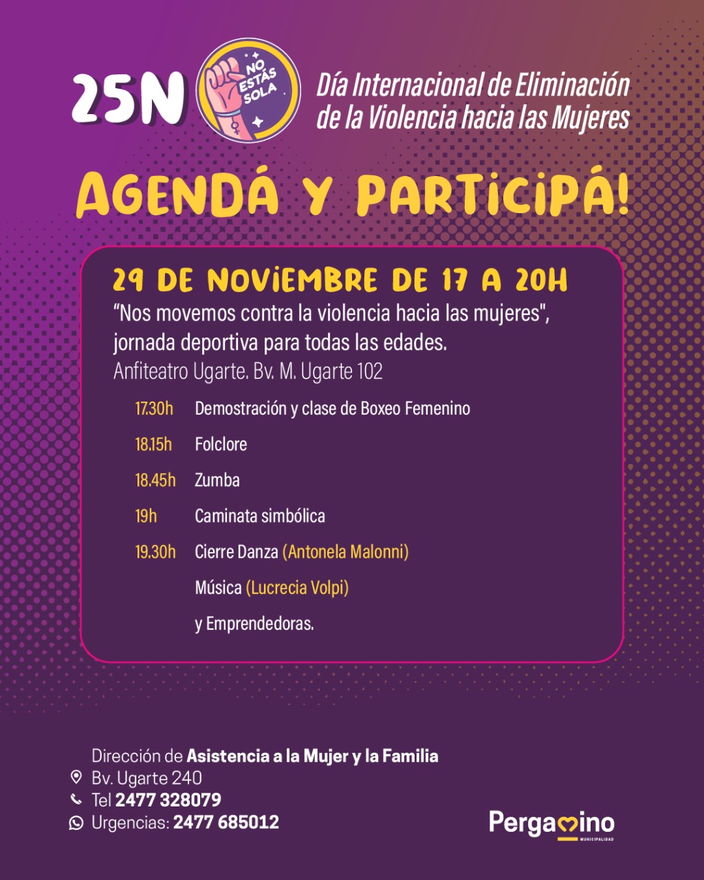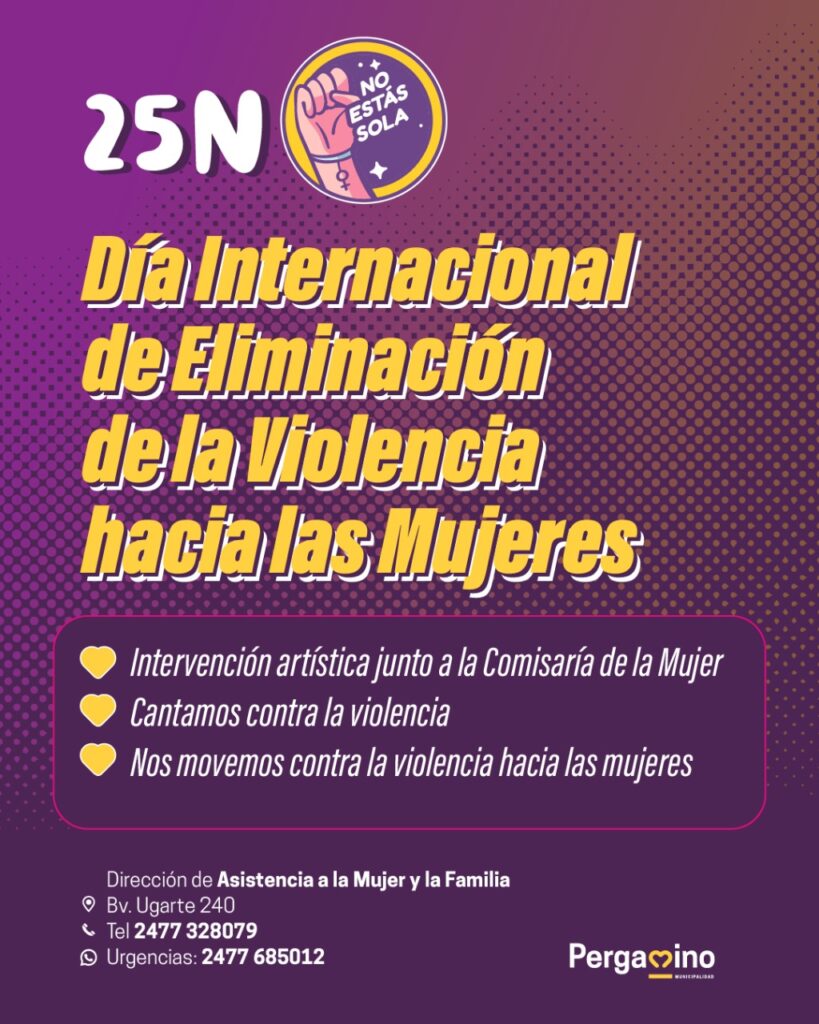 Cada 25 de noviembre, se visibiliza la problemática de la violencia de género y se pone en agenda el trabajo que se necesita para su erradicación. La Municipalidad de Pergamino llevará a cabo actividades con el fin de visibilizar esta fecha tan importante y sensibilizar sobre esta problemática.