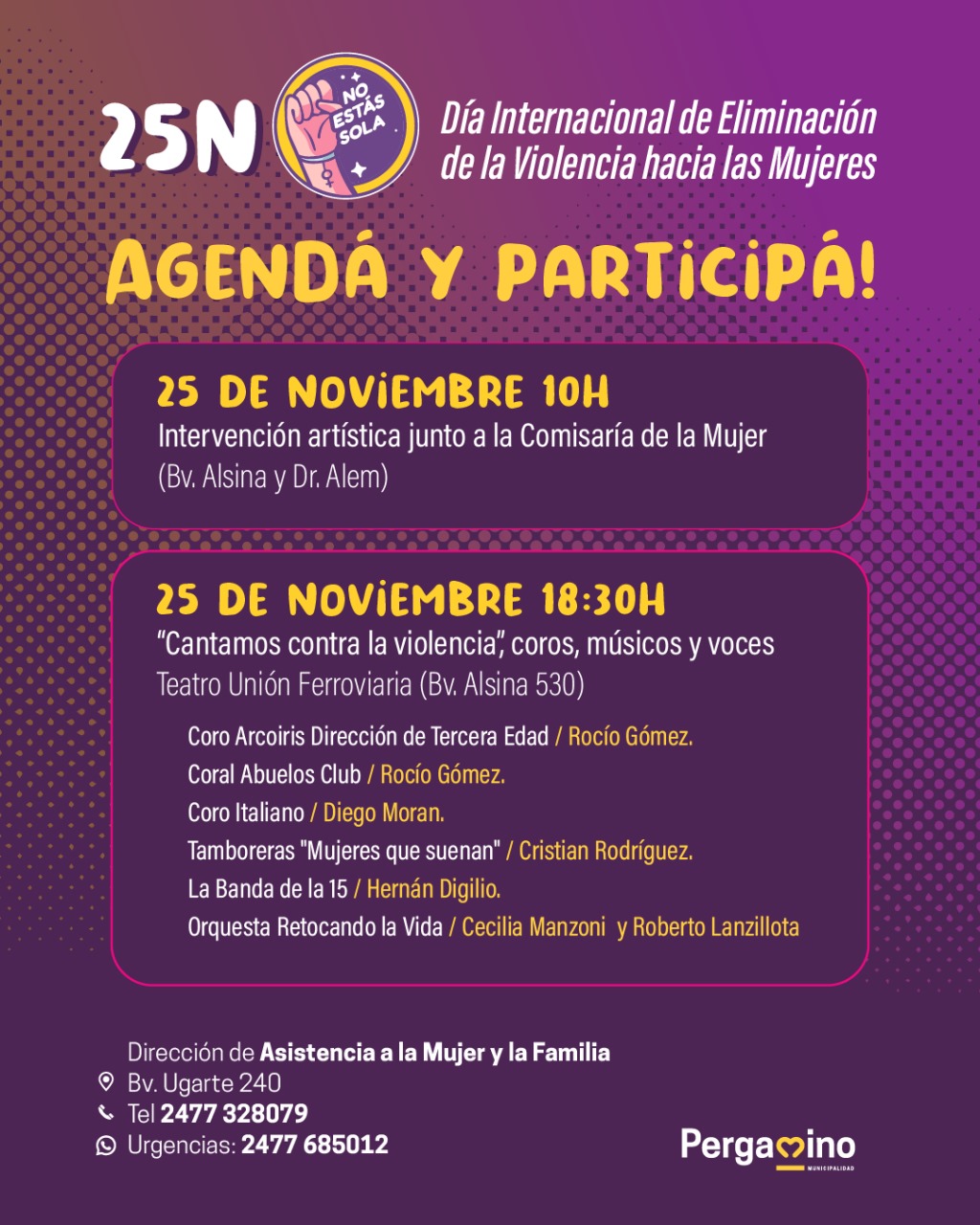 - 25 de noviembre 18.30 horas: “Cantamos contra la violencia”, coros, músicos y voces en el Teatro Unión Ferroviaria (Alsina 530)