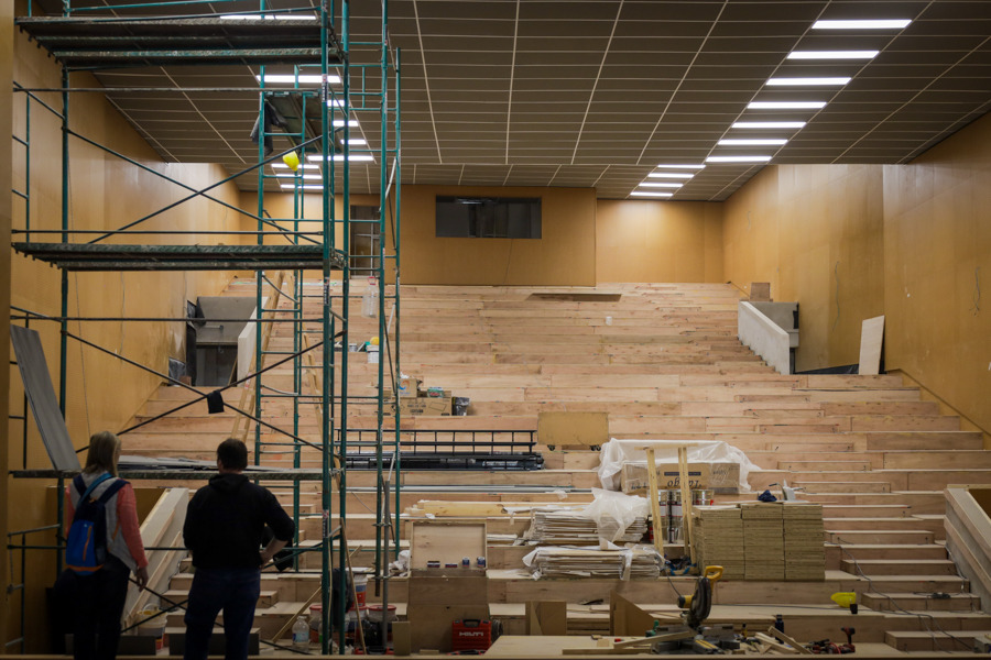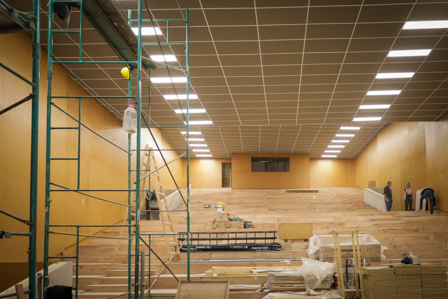 En paralelo, se continúa con el emplazado de la sala, los muros, y los pisos del escenario, además del inicio del comportamiento de fachada en planta baja y la ejecución del piso llaneado de hormigón.