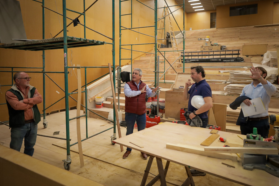 Durante la visita, el jefe comunal pudo observar el avance en la ejecución del cielorraso de triple altura, que incluye también los sectores del bar y la pasarela, donde actualmente se realizan tareas de revoque e instalación eléctrica.