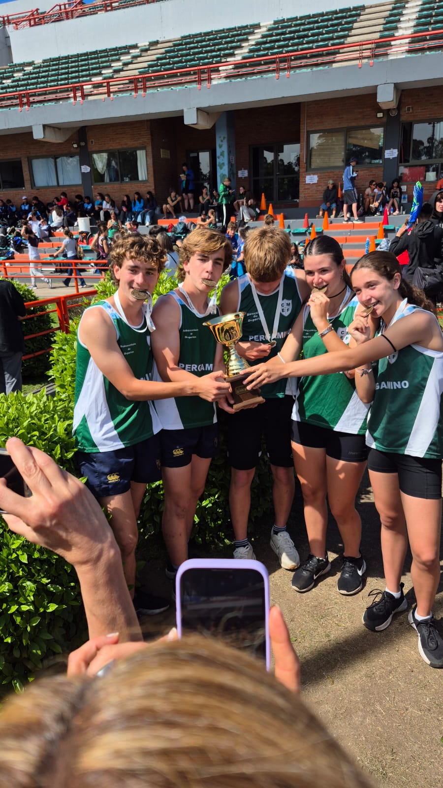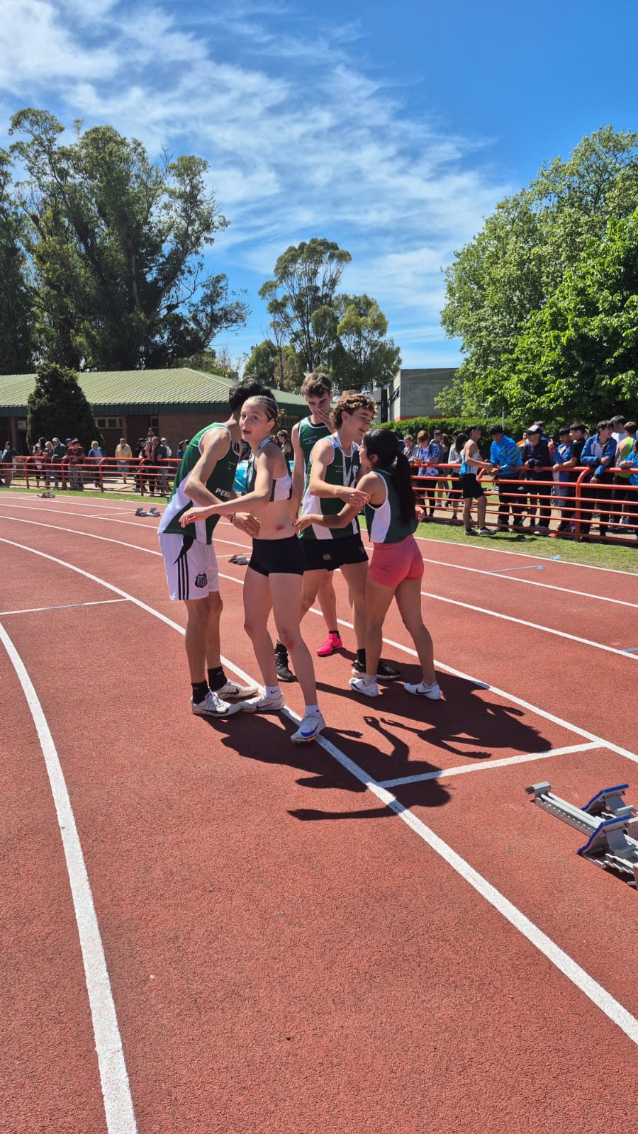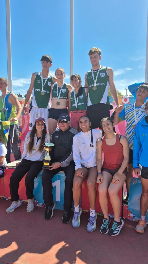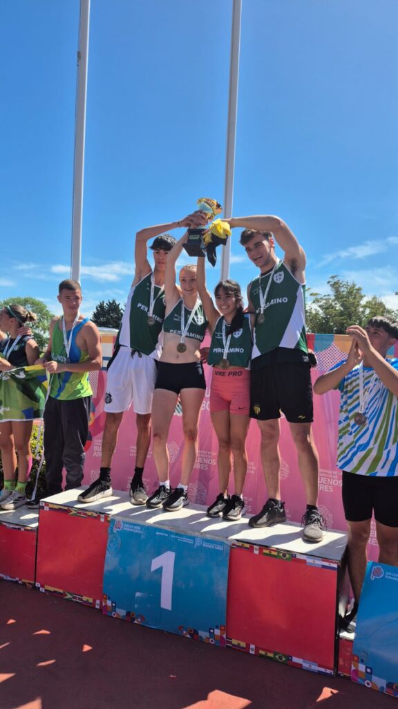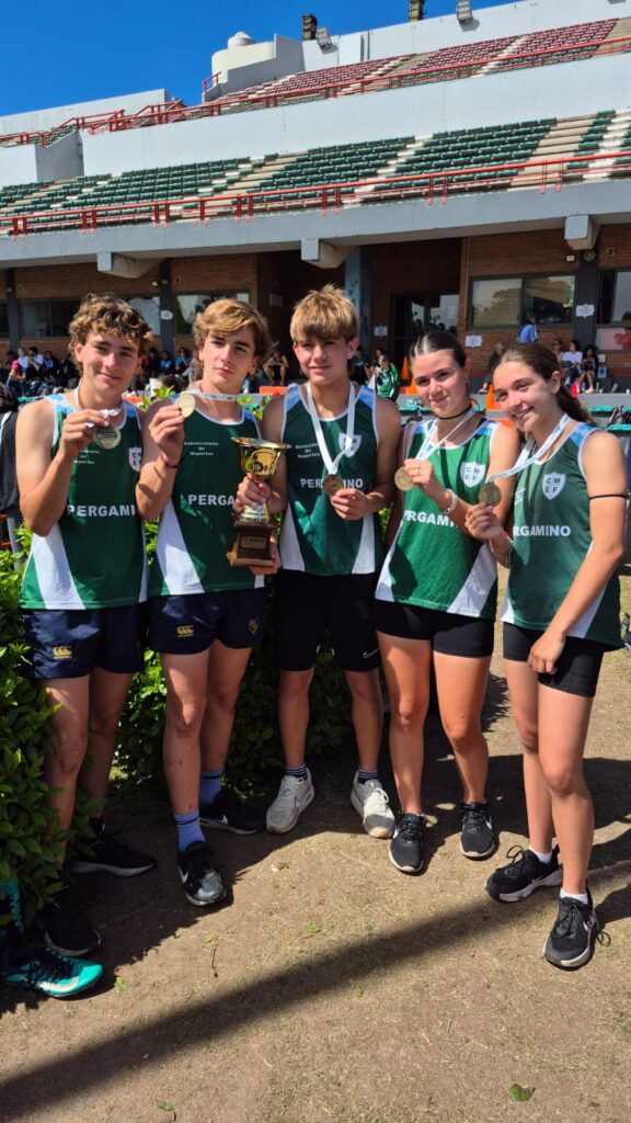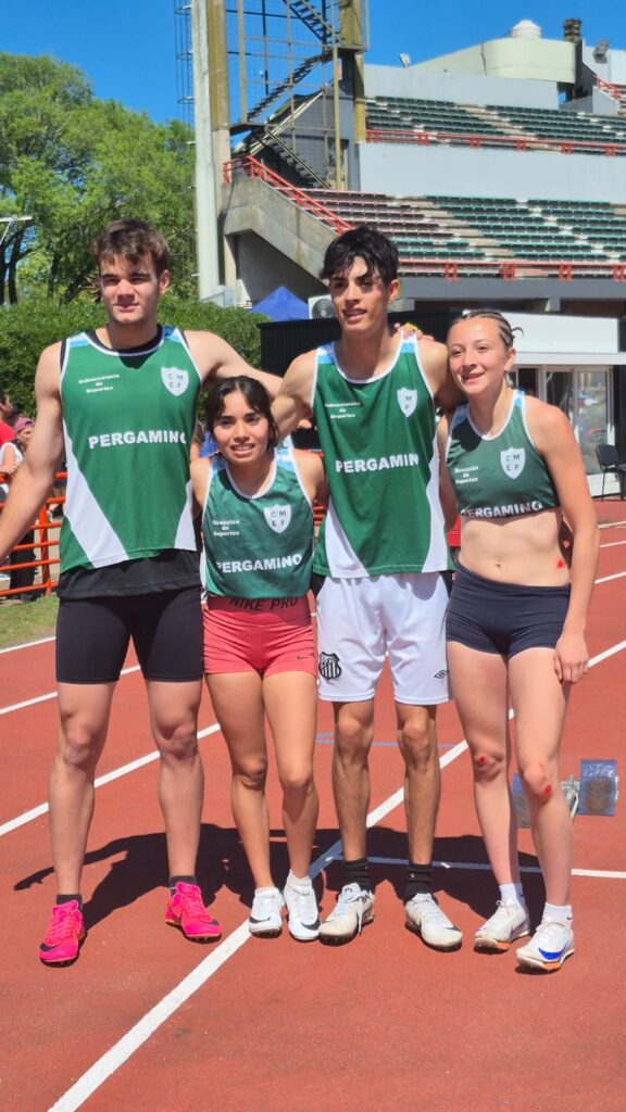 María Emilia Peluffo, Ulises Lozano, Simón Arce, Julieta Giavarini y Segundo Sánchez Granel se consagraron campeones en la prueba de posta Sub 14 Escolar. Un triunfo enorme que llena de orgullo a Pergamino.