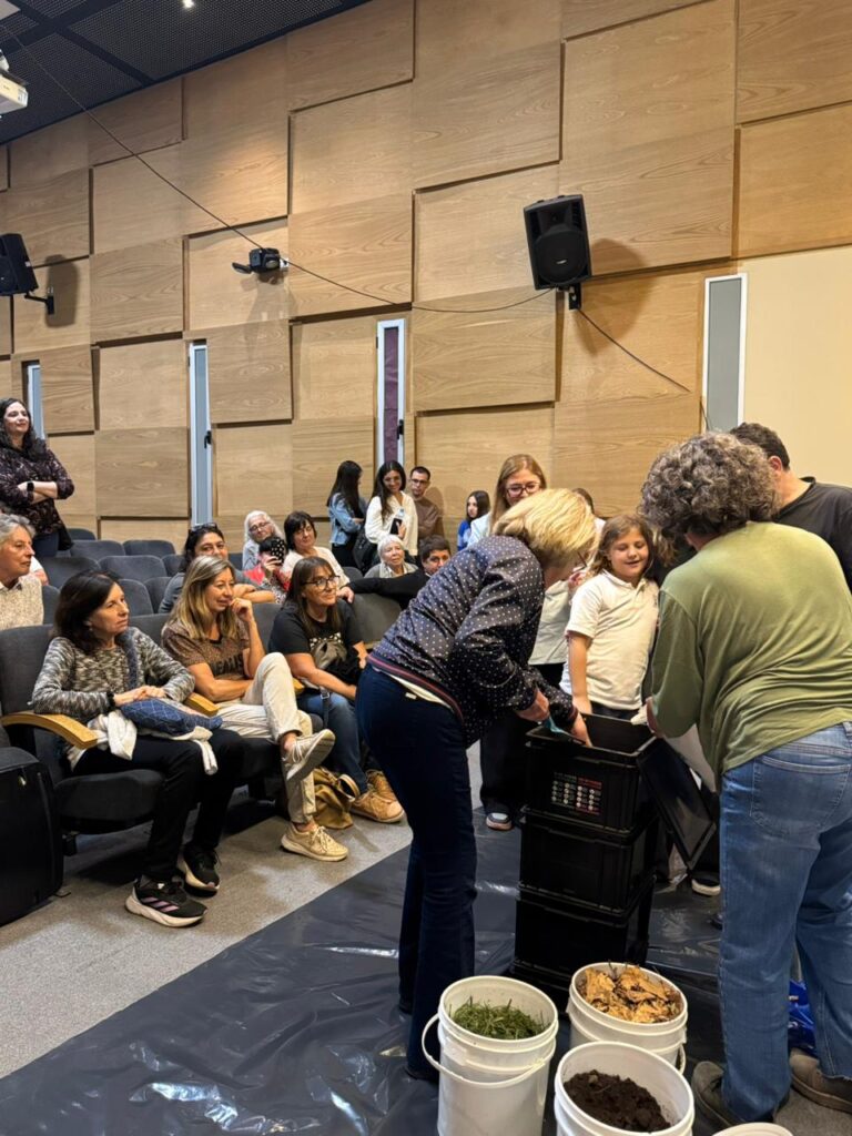 El cierre estuvo a cargo de Mónica Marucci, quien realizó la puesta en marcha de una compostera. Este momento generó una dinámica participativa, permitiendo observar el armado y conocer los pasos básicos para comenzar a compostar.
