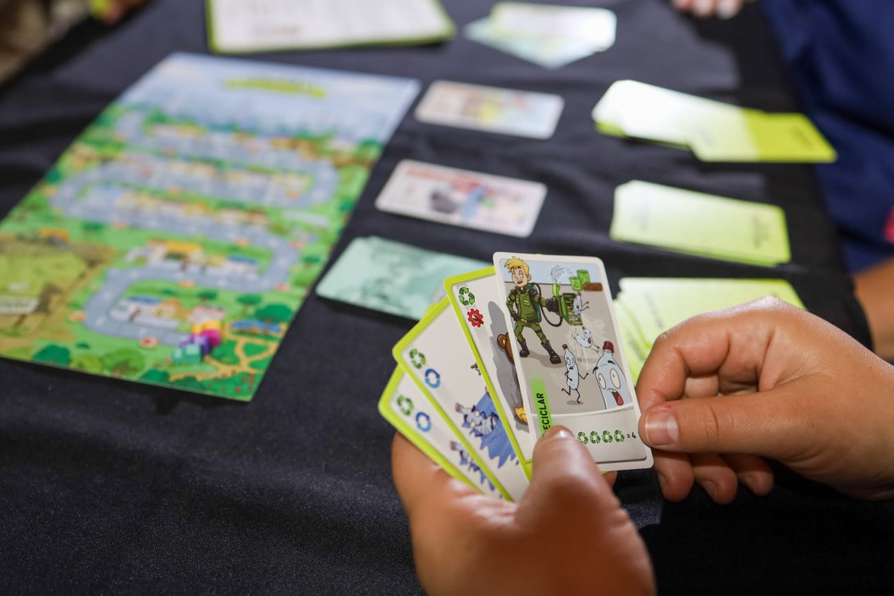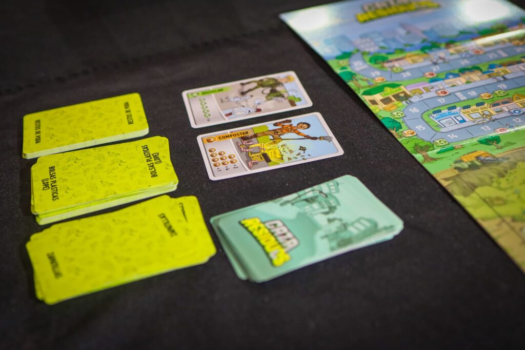 Durante la jornada se presentó el juego educativo “Caza Residuos”, el cuarto desarrollo de la editorial Tëkun, diseñado para enseñar de manera lúdica la correcta gestión de los residuos, promoviendo prácticas como el reciclado, el compostaje, la reconversión y la restitución de materiales, con énfasis en el aprendizaje activo y la experiencia social del juego.
